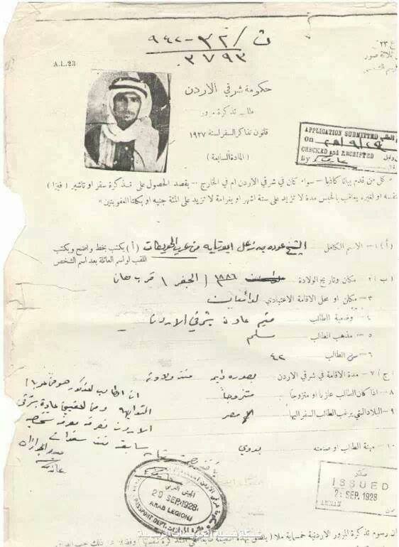 تأشيرة ( فيزا ) سفر لمصر للشيخ عودة ابو تاية الحويطات عام 1928
