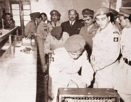 المغفور له باذن الله الملك الحسين بن طلال اثناء زيارته لقسم اللاسلكي في معسكر الملك طلال وهو يشاهد تلقي الاشارات والرد عليها من قبل العاملين في قسم الاشارة تعود الصورة الى فترة الستينيات