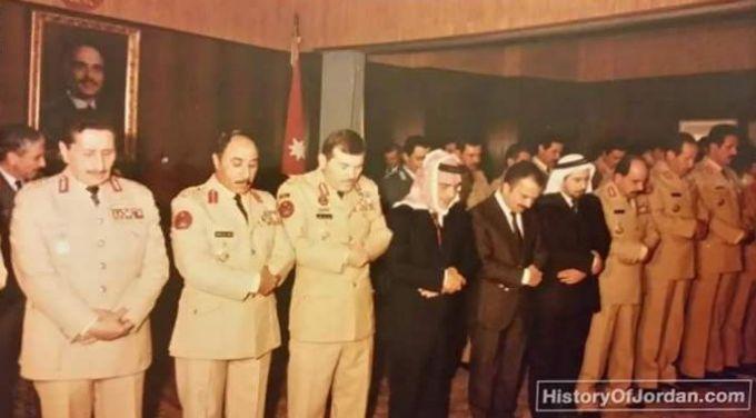 صورة من صلاة العيد من يسار الصورة : الفريق خالد الطراونة والعميد الركن عبدالله رشيد الشوبكي واللواء احمدعلاءالدين وجلالة الملك حسين بن طلال والأمير حسن و د.احمد هليل واللواء محمود التل والفريق سالم الترك واللواء نجيب المومني