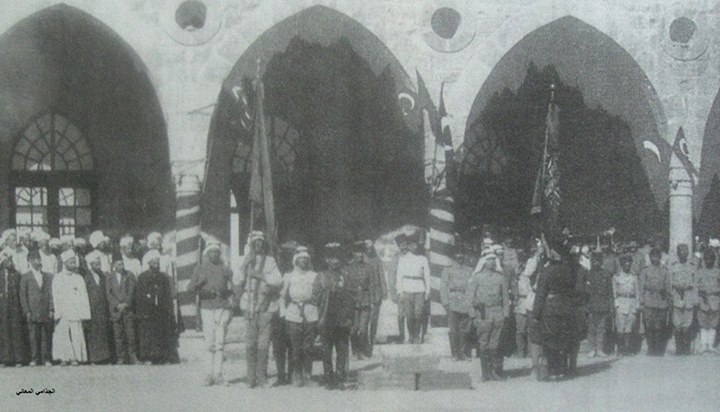 جموع المجاهدين يشكلون الكتائب والألوية من المسجد الاقصى للوقوف في وجه الهجمة الصليبية على دولة الخلافة الاسلامية عام 1914 م