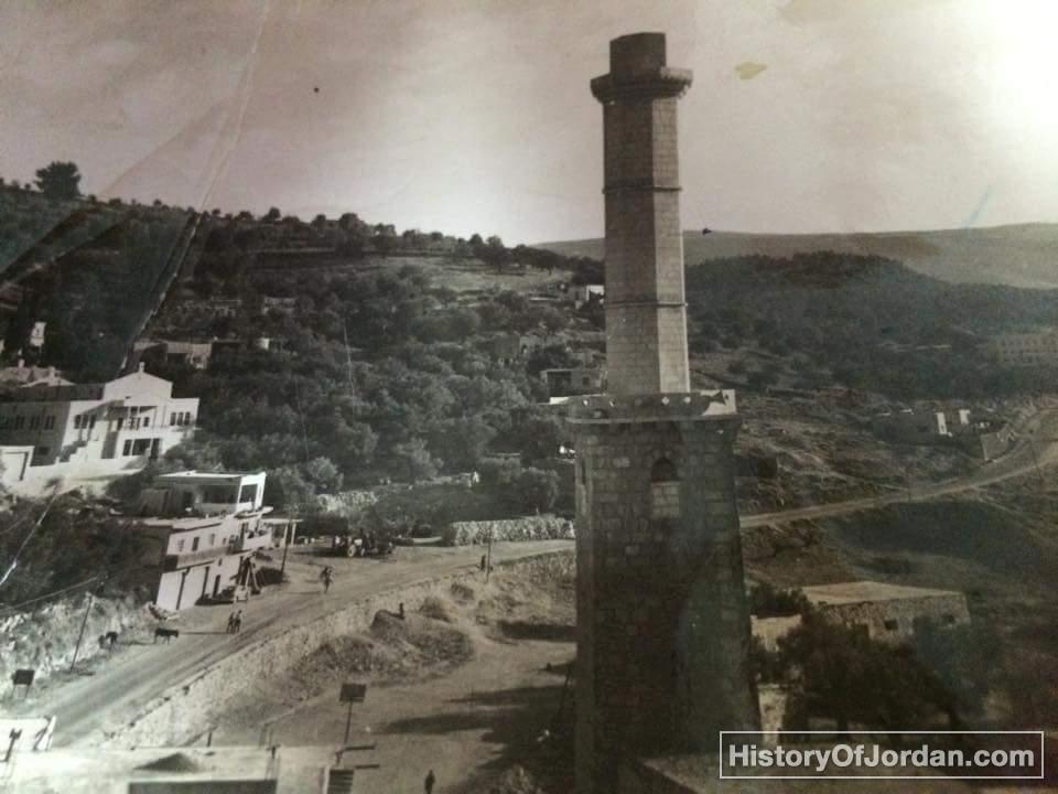 صورة من وسط البلد / عجلون ويظهر فيها المأذنه قبل الانتهاء من بنائها وذلك في الستينات